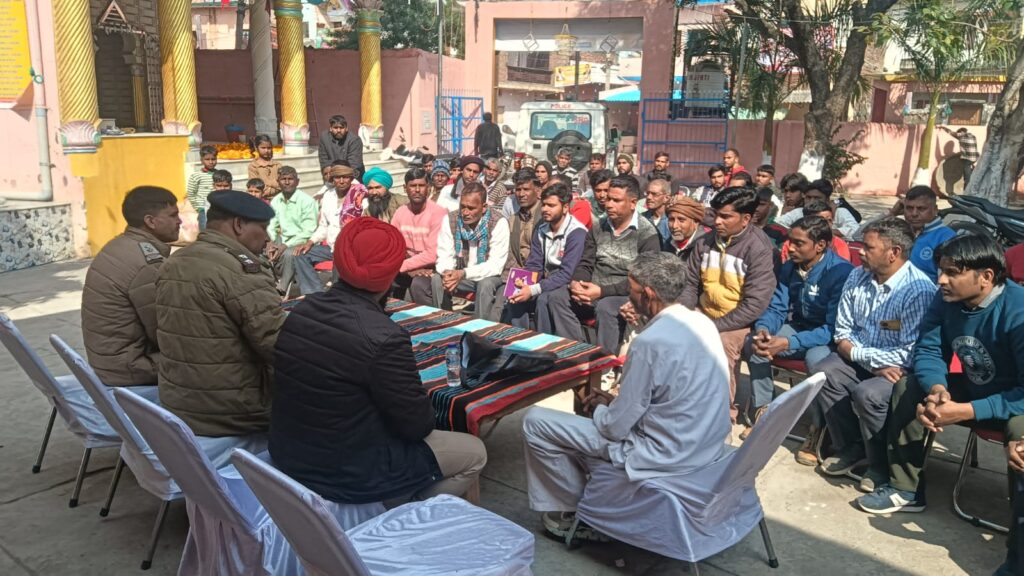 “झबरेड़ा में रविदास जयंती शोभायात्रा को लेकर मंदिर समिति के साथ बैठक करती पुलिस”